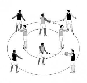 Description: Four players form a circle, arm’s length apart (cones can be used to help younger players to find the correct position); the remaining four players form an outer circle 2 m away. The players in the inner circle jog in a clockwise direction and the players in the outer circle jog in an anti-clockwise direction. The ball must be passed from one player in a circle to another player in a different circle as the players are jogging around.