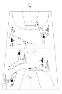 Description: The players form two lines, 2 m away from the zone at positions A and B. The first two players in line A start with a ball. The first player dribbles towards the basket and performs a lay-up shot (leaving the ball) and immediately joins the back of line B. The first player in line B moves towards the basket, collects the rebound and passes to the third player in line A and then joins the back of line A. Whilst this is happening, the second player in line A who has a ball is dribbling to the basket to attempt a lay-up shot. This sequence continues.